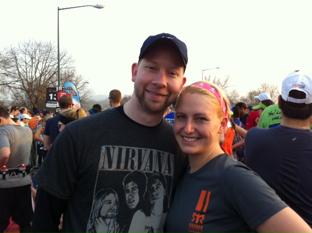 Saturday morning, we got up in enough time to use the metro...because my car was locked in the garage (awesome.) Thankfully, the metro was easy to navigate and despite an almost 20 minute wait, we wound up at RFK around 6:15 where we met up with Amanda. After the usual "I have to pee, wait, where did I put my timing chip, can you hold this gu pack?", we ran over to see Coach T so I could get a pep talk, a hug and a high five.